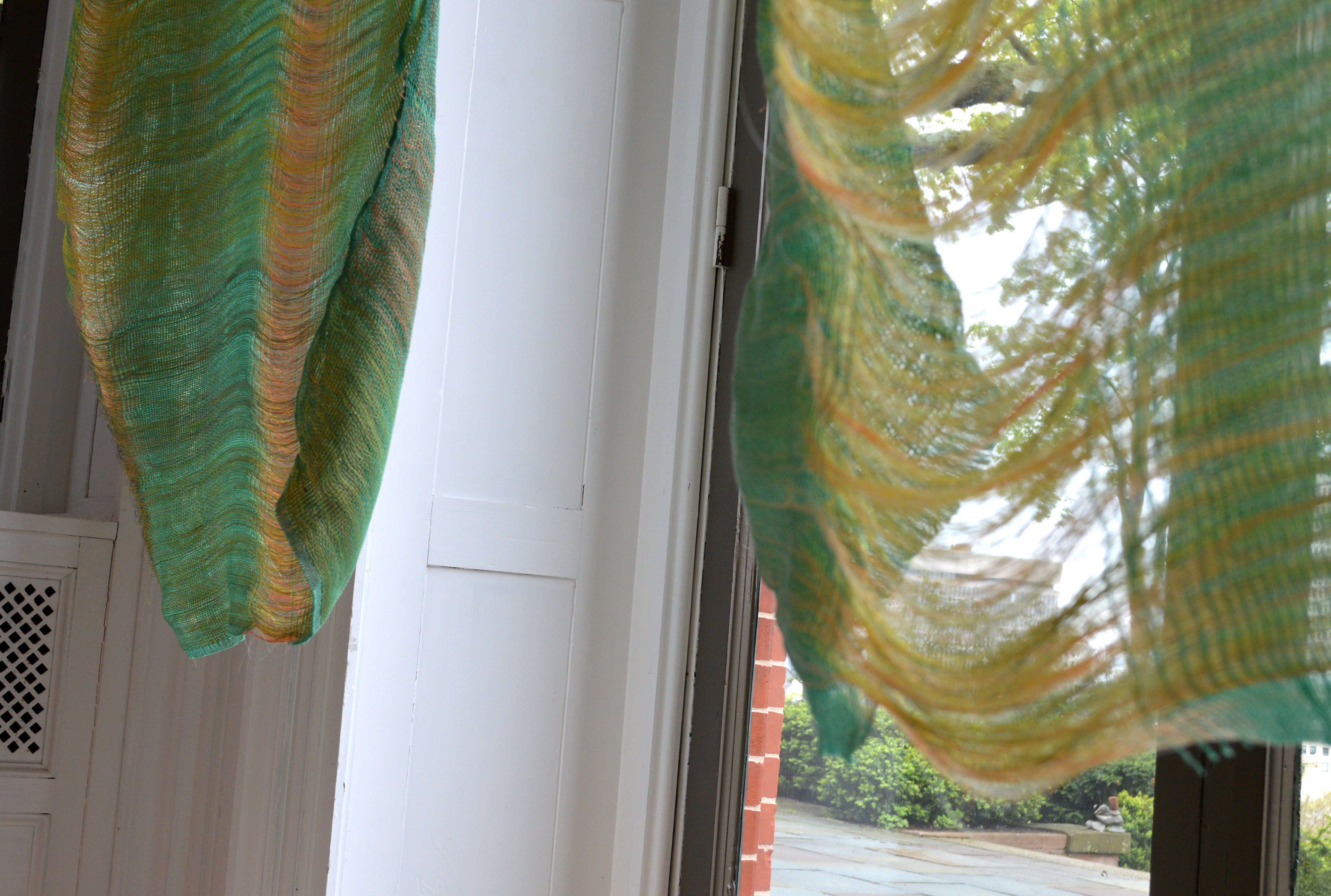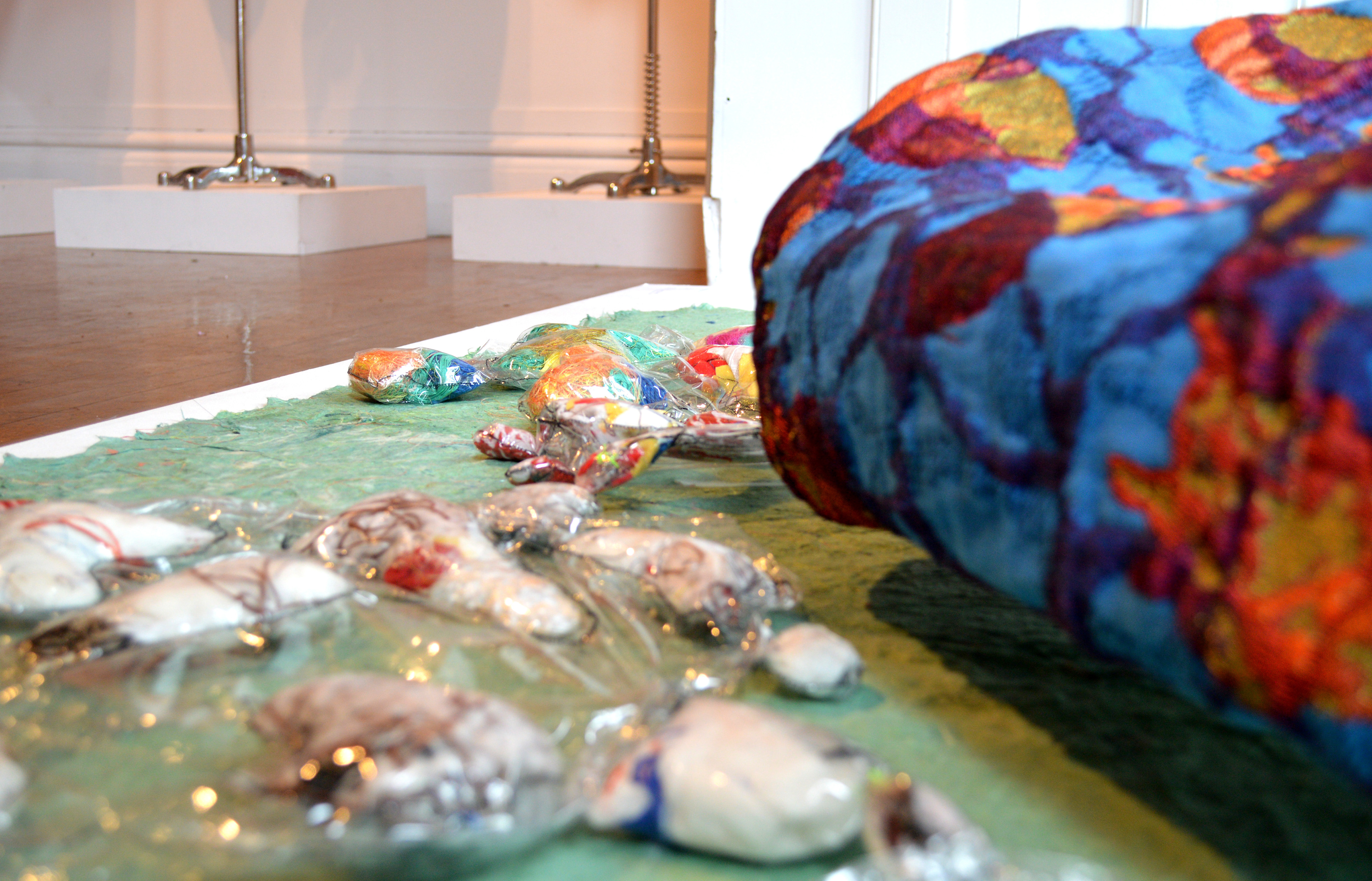 During the conceptualization stage I envisioned each aspect of the “garden” to be made with different techniques. For the “trees” I wove polyester and rayon threads into “pockets” formed by intersecting layers. I designed jacquard fabric for “pond” using motifs of my childhood and culture- koi fish and oranges for good intentions. I then wrapped the jacquard around a frame of poster board and chicken wire. The “turtles” I sewed out of vinyl and the leftover scraps from the other pieces. Lastly I handmade the green paper the whole “garden” rests on out of kozo fibers.